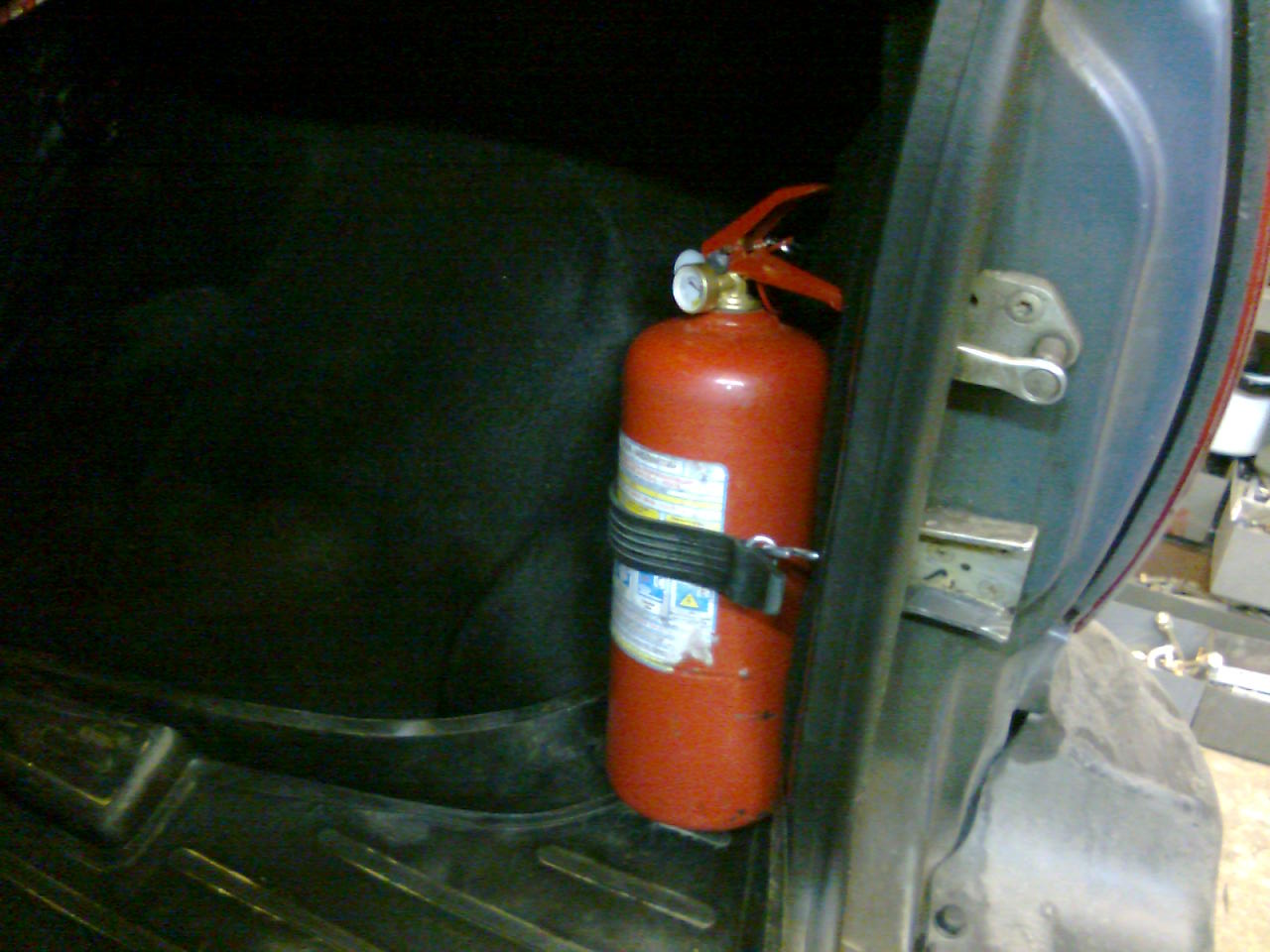 ). По правилам всегда надо иметь с собой. Давно хотел этот свой ОП определить таким образом, чтоб закреплен был. Всё довольно просто. Когда снимаешь войлочную обивку справа,то помимо арматуры бензобака, сразe видно скобку крепления приделанную на заводе-не знаю , что подразумевалось крепить там и чем. Вообщем, я купил резиновое крепление то ли бачка омывателя 2123, то ли крепления инструмента для 2108 -оба крепления в одну цену,около 40 руб.Резиновая лента со скобками. Прорезал войлок, вывел скобку-закрепил пассатижами один конец на скобке-а второй идет на крючок с резьбой, купил в строймаге,обрезал и приделал (там всё понятно,даже дырка есть от пласт-пистона,разберетесь,по фотам видно всё). Всё, разогнул второй крепеж резиновой ленты, сделал поменьше,поствил ОП,закрепил-и вуаля,! Работы на 30 мин.Теперь ОП имеет свой крепеж